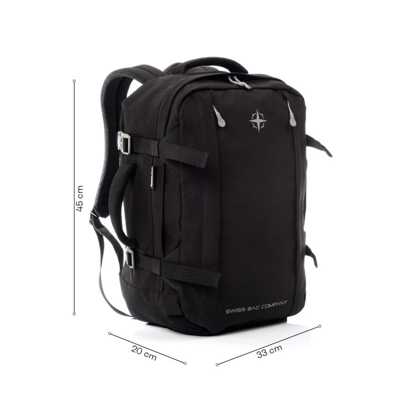 The SwissBags Cointrin backpack is a reliable companion for every trip, perfectly sized to fit most airlines' carry-on luggage requirements, measuring 45x33x20 cm. Made of high-quality polyester, it guarantees durability and resistance to damage, and its 35-liter capacity allows for plenty of space for all your essentials.