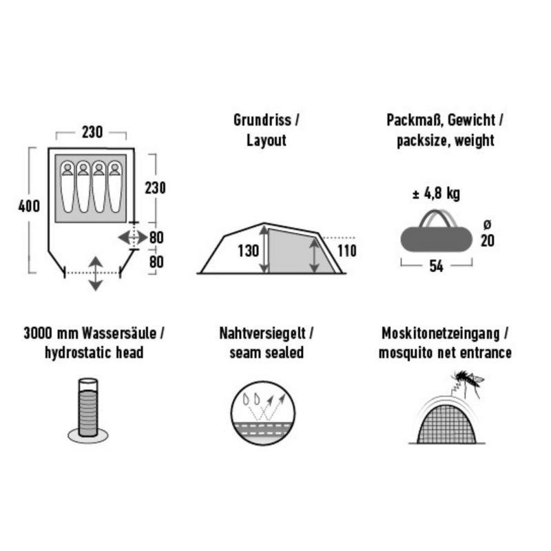 High Peak Falcon 4 LW Tent Olive-Red 10334 The High Peak 4-person tourist tent is perfect for camping in the bosom of nature. Tunnel construction. The tent is made of durable material with waterproof properties. Laminated seams. Aluminum frame. The vestibule allows you to spread out your equipment. You can enter the tent from the front or from the side. A window that increases the access of air and light to the interior. Use of a mosquito net. Internal pockets. The whole thing is packed in a practical, zipped bag. Technical data: Number of people: 4 Waterproof: 3000 mm water column Flysheet: 100% polyester, PU, taped seams Bedroom: 100% breathable polyester, entrance - mesh Floor: 100% polyethylene (PE), fixed Frame: aluminum 7001 T6 - 9.5 mm Dimensions: 400 cm x 230 cm (including vestibule) Height: 130 cm (vestibule), 110 cm (bedroom) Dimensions after folding: 54 cm x 20 cm Weight: 4.8 kg Red tape around the bottom of the flysheet visible after dark Color-coded poles