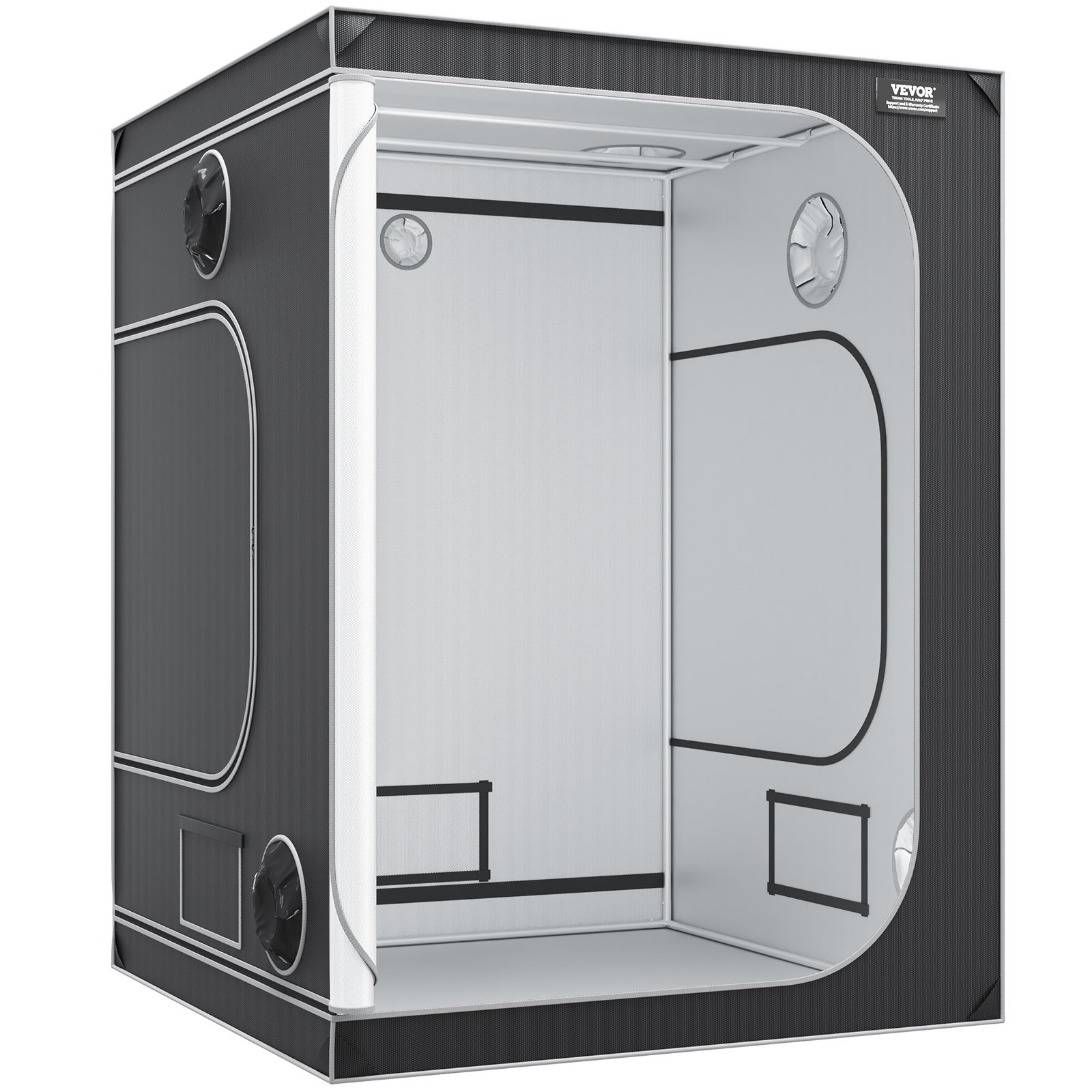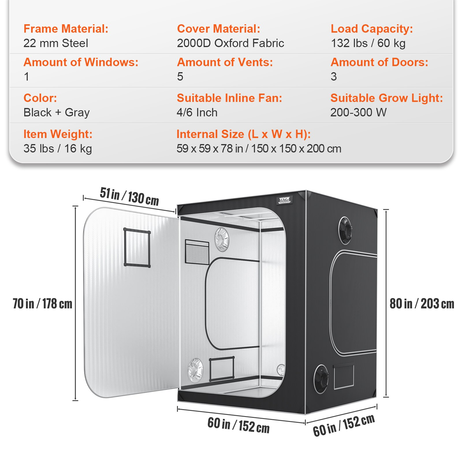 Internal Size (L x W x H): 59 x 59 x 78 in / 150 x 150 x 200 cm,Suitable Inline Fan: 4/6 Inch,Load Capacity: 132 lbs / 60 kg,Suitable Grow Light: 200-300 W,Item Size (L x W x H): 60 x 60 x 80 in / 152 x 152 x 203 cm,Color: Black + Gray,Item Model Number: GT2000D60,Cover Material: 2000D Oxford Fabric,Frame Material: 22 mm Steel,Door Size (L x W): 70 x 51 in / 178 x 130 cm,Item Weight: 35 lbs / 16 kg